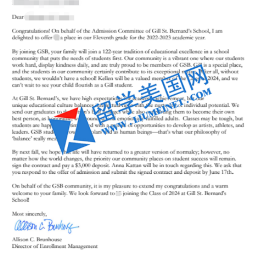 学校简介 Gill St.Bernard School(吉尔圣伯纳德学校)拥有非常悠久的历史。1900年,St. Bernard’s School由Thomas A.Conover创立,这是一所为男生提供教学的学校。1934年,Elizabeth Gill在Bernardsville创办了女校Gill School,目的是为更多女生提供受教育的机会。1972年,两所学校合并,成为一所男女合校。学校注重学生的全面发展,除了让学生们在学业上获得成功,还希望学生们能够成为正直、善良和富有共情能力的公民。 录取案例 学校特色 1.地理位置:学校距离纽约车程大约1小时,当地社区治安良好,居民受教育程度高,60.4%的居民完成了本科教育。 2.课程设置:课程设置丰富,不同难度的课程共开设100余门课程,满足学生的需求。 3.Spring Unit Program项目:是学校的标志性项目,设立已经有50余年的时间,高中学生可进行为期两周的实践性学习。 4.师资力量强大:60%的教师具有硕士及以上学历,包括哥伦比亚大学硕士、康奈尔大学硕士、普林斯顿大学硕士等。 5.运动突出:学校设有59支运动队伍,从2015年起获得过70次的各类比赛冠军。 6.艺术优异:学校的PACC艺术中心于2018年正式落成,每年会进行戏剧表演和艺术展,让学生们展示自己的才华。 基本信息 成立时间:1900年 学校性质:私立走读制男女混校 宗教背景:无 校园面积:208英亩 学校人数:约613人 国际学生:1人(高中部) 年级设置:PK-12年级 师生比例:1:7 平均班级人数:15人 AP课程:24门 ESL课程:无 具有硕士以上学历的师资:60% SAT平均分:1350 ACT平均分:30 大学升学率:100% 学校设施 校园面积约208英亩,风景如画,在校园中学生们可以欣赏到花园、温室、池塘、溪流组成的美景。此外,还有一个农场和养蜂场,让学生们获得不同的体验。学校的运动设施完善,体育中心占地面积27000平方英尺,设有篮球场、室内跑道、更衣室、运动俱乐部、运动餐厅等。学校还有占地面积14400平方英尺的运动场,包括健身中心和更衣室、足球场、长曲棍球场、棒球场、垒球场、网球场等。 学校周边 学校所在的Gladstone位于纽约市西部,距离纽约车程大约1小时。这里治安良好,居民受教育程度高,60.4%的居民完成本科教育。 新泽西州(State of New Jersey)是美国第四小以及人口密度最高的州。其州昵称为“花园州”。房地产、制造、批发贸易、金融保险、专业及技术服务等为新州主要产业。新州制造业发达,尤以制药业较为突出,该州的制药业在全美名列第一。此外,新州在高科技研发、服务业也具备领先优势。 附近机场:纽瓦克自由国际机场(EWR),约45分钟车程 附近城市:纽约,约1小时车程 附近大学:普林斯顿大学,约40分钟车程 课程设置 AP课程 艺术与设计、艺术史、生物学、微积分AB、微积分BC、化学、计算机科学A、计算机科学原理、英语语言与写作、英文文学、环境科学、欧洲历史、法语、人文地理、拉丁文、微观经济学、音乐理论、物理、心理学、西班牙语、统计、美国政府与政治、美国历史、世界历史等。 荣誉课程 代数2/三角函数、生物、微积分、化学、合唱、英语9-12、法语9-12、拉丁语9-12、物理学、微积分Pre、西班牙语9-12等。 Spring Unit Program 这是学校的标志性项目,设立已经有50余年的时间。该项目针对高中学生,在每年的5月,学生们将进行为期两周的实践性学习,学习的课题包括: 文化类:亚洲文化、人与自然、公民权利等; 环境类:食物与农业、可持续发展、海洋探索等; 实践类学习:烹饪、园艺、急救911、新泽西当地文化探索等; 服务学习:社区服务等; 实习类:实习类项目针对11-12年级学生,学生们有机会在合作的机构进行实习,从而对职业发展进行探索。 表演艺术课程:舞蹈、戏剧、影视、表演、"舞台设计等计; 视觉艺术课程:绘画、油画、雕塑、陶艺、AP 2D艺术、摄影、木工、平面设计、工作室艺术等。 艺术项目 学校的PACC艺术中心于2018年正式落成,中心能够容纳400余位观众。除了艺术中心以外,校园内还设有展览中心,学生们的作品可以在这里展出。 视觉艺术主任Sarah Isusi老师具有马里兰大学视觉艺术硕士学历,她曾经教授过IB艺术课程,也曾在费城艺术中心工作。同时她还是新泽西艺术教育协会(N.J.Art Education Association)的成员,她还和新泽西州当代艺术中心合作,每年都会展出她的作品。 表演艺术主任Paul H. Canada具有罗格斯大学的艺术硕士学历,他指导的戏剧表演作品获得过多个奖项,他还和多位导演、设计师合作,为学生们提供更多机会。 体育项目 秋季运动: 男子足球、女子足球、女子网球、男子越野、女子越野、女子排球 冬季运动: 男子篮球、女子篮球、拉拉队、男子击剑、女子击剑、冰球、男子室内田径、女子室内田径、男子游泳、女子游泳 春季运动: 棒球、垒球、高尔夫、男子曲棍球、女子曲棍球、男子网球、男子田径、女子田径 2021-2022获奖情况: 学校设有59支运动队伍,从2015年起获得过70次的各类比赛冠军。获奖记录: 男子足球北新泽西州Non-Public B 冠军 男子篮球Skyland Conference联赛冠军,Somerset County冠军女子篮球 Skyland Conference联赛冠军 男子网球 Skyland Conference联赛冠军 垒球Prep B冠军 俱乐部 国际象棋俱乐部、社区艺术俱乐部、活动俱乐部、环境俱乐部、钓鱼俱乐部、动物俱乐部、GSB俱乐部、性别平等俱乐部、多元化俱乐部、读书俱乐部、希望俱乐部、数学联盟、模拟法庭、模拟联合国、户外俱乐部、机器人俱乐部、滑雪俱乐部、学
