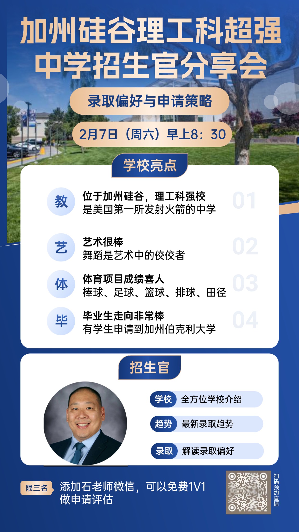 一、陈老师介绍学校详情 我们学校确实位于圣何塞,圣何塞位于硅谷中心,最早期是苹果公司都是从这边开始的。像很多科技公司都在南湾区,类似于美国的”深圳“。招生年级是6-12年级。 我们叫山谷基督学校,是K-12,是一所大学预备中学,中学生是有1600个学生,学校对于美国私立学校是比较大的学校。9年级到10年级的学生大概有400名左右,我们初中也比较大,有700个学生。初中是6年级到8年级,每一批的学生大概200名学生都在一起,山谷基督学校重视综合发展。 学校核心优势:全人发展的四大支柱 陈老师将学校的教育优势总结为四大方向: 卓越的STEM与理工科 国际空间站合作项目已持续十余年,极具特色。 提供机器人、AI、编程等前沿课程,并拥有强大的数学队(AMC竞赛常胜)。 商科、演讲与辩论实力强劲,支持学生创业探索。 强大的体育项目 拥有52支运动队,涵盖23个体育项目,包括篮球、橄榄球、游泳、网球等。 体育成绩斐然,曾有学生凭游泳特长考入普林斯顿大学。 丰富的艺术教育 涵盖音乐、舞蹈、戏剧、视觉艺术、媒体艺术等。 拥有乐团并常参与各类演出,提供充分的展示平台。 扎实的学术准备 提供超过180门课程,其中包含70多门AP及大学选修课。 学生平均每年修读4门AP,为大学申请积累高含金量学分。 升学支持与成果: 每年有超过200所大学的招生代表到校宣讲,学校也组织学生赴全美各地访校。 配备10名经验丰富的升学顾问,从选课规划到申请文书、推荐信提供全程指导。 升学率近100%,每年约有60%的毕业生获得加州大学系统(UC)录取,大部分学生进入全美前50大学。 二、陈老师揭秘:我们青睐什么样的学生? 陈老师明确指出了三点核心录取偏好: 学术成绩良好:课程难度高,需要学生具备扎实的学术基础和学习能力。 对STEM等领域有浓厚兴趣:希望学生在当前学校已积极参与相关活动,拥有突出的课外实践背景。 性格积极外向,主动性强:学校规模大、资源多,需要学生能主动探索、积极沟通、快速适应,主动争取和利用各种机会。 国际生申请须知: 招收6-12年级学生,无需入学考试。 需要提交托福成绩,最低要求80分。 学校为走读制,可协助安排经过审核的寄宿家庭,目前有来自全球的60余名国际生。 三、子乐妈妈分享真实就读体验与成长见证 孩子的成长和变化还是很大,首先充满“爱”的社区氛围:孩子入学不久,便被邀请到老师家中参加迎新烧烤。这种“师生如家人”的亲密关系,让孩子倍感温暖,迅速融入了新环境。子乐妈妈特别提到,孩子为此兴奋地分享了三次。 个性得到尊重与发展:学校尊重学生的个性选择(如发型),在“松弛”而非压抑的环境中,孩子反而更自觉、更快乐地学习。 无微不至的关怀:老师会细心关注到没带午餐的孩子并提供帮助。这种源自基督教“爱人如己”理念的关怀,体现在校园的各个细节中。 看得见的成长:孩子从之前的容易焦虑,变得更加乐观、从容,思维方式从“负面预设”转向“积极等待结果”。这种心智的成熟,是家长最为欣慰的收获。 陈老师补充道,作为一所基督教学校,品格教育和价值观塑造是教育的核心。学校通过言传身教,培养学生正直、友爱、自律的品格,并对毒品、校园霸凌、手机使用等管理极为严格,营造了安全、健康的成长环境。 四、教育共识:价值观与思维模式决定未来能走多远 石老师与陈老师、子乐妈妈在交流中,形成了深刻的教育共识: 教育的首要目标是培养“人”:相较于单纯的学术竞争,树立正确的三观、培养健全的人格更为重要。教会学校在这一点上具有独特优势。 安全感与归属感是成长的土壤:学校提供的“有爱、有序、有界限”的环境,让孩子获得安全感,从而敢于探索,潜能得以释放。 积极的思维模式是终身财富:美国教育的精华之一,在于帮助学生建立积极、正向的思维方式。这决定了他们未来能否从容应对挑战,走得更远、更稳。 五、美本主要看学生的特点 成绩重要,另外就是课外活动方面有突出的优势。美本最主要看重综合能力方面。 今天的分享就到这里,感谢陈老师和子乐妈妈~另外i山谷基督学校2026年秋季入学申请正在进行中,如果您对这所充满活力的硅谷名校感兴趣,欢迎进一步咨询。 留美网24小时热线:15011066813