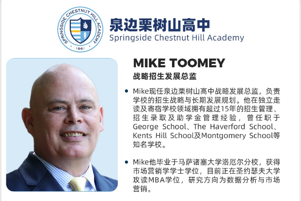 3月14日美国顶尖走读高中泉边栗树山学校面试会预约开启~对于计划申请美高的家庭来说一定是非常好的福利和机会!还在等什么,抓紧时间预约~名额有限,先到先得! 这次面试会学生将有机会: 足不出户,即可与美高招生官面对面交流; 参与一对一深入沟通,全面展示个人特质与潜力; 提前积累面试经验,提升后续正式申请的竞争力。 如果面试顺利,当场可以拿到录取offer!!! 这样的机会不仅有助于孩子更直观地了解学校招生倾向,也能在申请中抢占先机。名额有限,感兴趣的家庭请尽快行动! 招生官: 面试会时间:3月14日下午3点 地点:迈润肯办公室 联系我们的顾问老师预约: 电话:15011066813 13910531929 微信:liumeinet2014 泉边栗树山学校 Springside Chestnut Hill Academy介绍: 石老师曾经走访考察过这所学校,这是一所当之无愧的顶尖精英高中,藤校录取率高达25%,学校距离费城市中心仅10英里,占地60多英亩。学校有两个“顶级”,拥有世界顶级的物理试验室;机器人项目非常强。 学校优势: 1、学校成立于1861年,拥有超过160年教育经验。全美私立K-12学校TOP 8%,STEM高中TOP 7% 2、地理位置优越,学校坐落于费城西北部精英区Chestnut Hill,安全宜居,临近宾夕法尼亚大学、普林斯顿大学、布林茅尔学院。 3、师生比1:7,平均班级人数15人,73%教师持有高级文凭。 4、学校课程丰富,提供14门AP课程,多门荣誉课程及高级课程。 5、创业领导力项目中心(CEL,Center for Entrepreneurial Leadership)在2012年秋季成立,与知名的宾夕法尼亚大学沃顿商学院合作,在校学生有很多机会直接参与专利项目。此外,创业领导力中心还为学生提供丰富的校外资源,提供大量实习机会。 6、工程与机器人项目强势,拥有16支机器人团队,1600平方英尺机器人实验室,设备先进; 7、学校在2019年获得FIRST全球机器人大赛冠军,学生可参加3年机器人课程。在过去的10年中,机器人队的学生们进入到众多一流工程类高校或者知名高校的工程专业,包括麻省理工学院、加州理工学院、哥伦比亚大学、普林斯顿大学、伍斯特理工学院等。 8、体育Inter-Ac联盟成员,多次获得联盟冠军,学校设施齐全,有室内赛艇模拟设施(US ROWING认证)、6个体育馆、网球场、田径场、划船训练场等。 100%升学率,近年毕业生名校录取包括普林斯顿大学、斯坦福大学、耶鲁大学、宾夕法尼亚大学、康奈尔大学、哥伦比亚大学等。 名额有限,先到先得,感兴趣的家长抓紧时间联系我们预约~ 留美网24小时热线:15011066813 专家热线:13910531929 微信公众号:liumeinet(迈润肯高中留学) 顾问微信:liumeinet2014 .png)