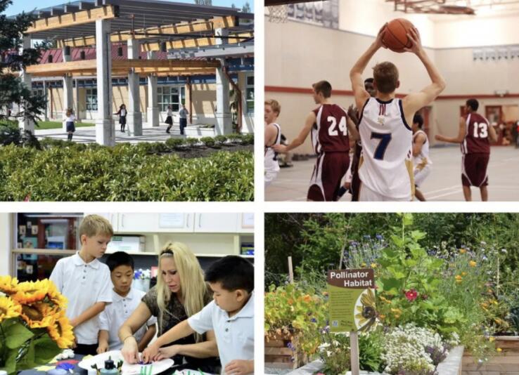 在占地27英亩的美丽的公园式校园内,拥有一栋主教学楼和多栋配套建筑、四万多册藏书的图书馆、五个科学实验室、设备齐全的游乐场、两个运动场、两个大型温室等建筑设施。此外学校还有一个骑马场、一个统一的商店、设计大楼和技术中心,更多校园设施不断升级中。
