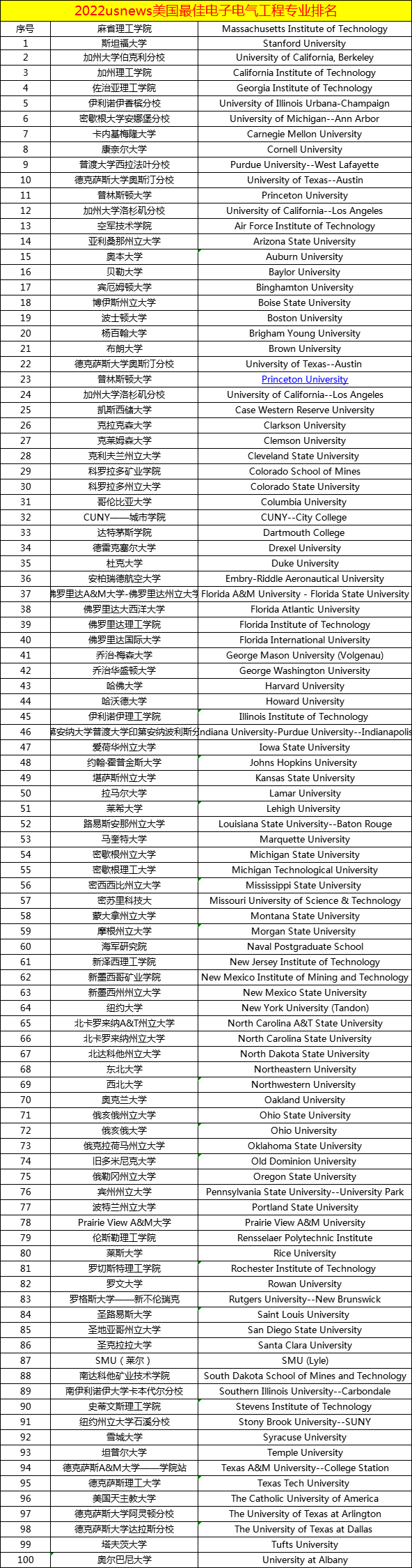 五、2022usnews美国最佳电子电气工程专业排名top100
