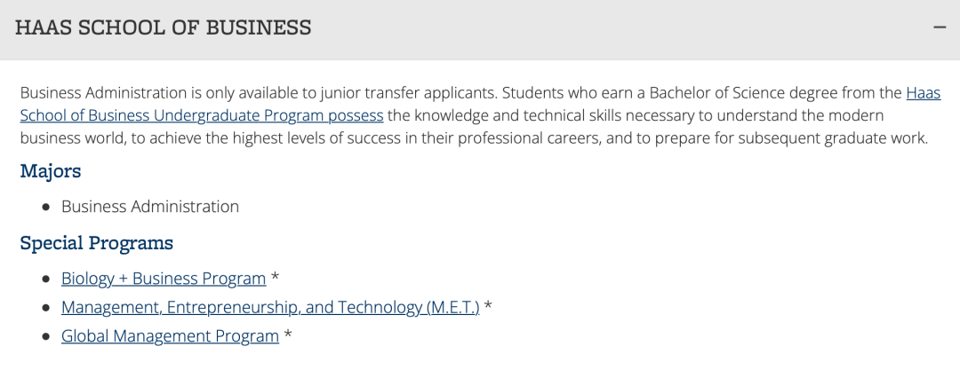 MET项目:管理、创业与创新技术项目会在学生毕业时由工程学院和哈斯商学院同时授予双学士学位,有生物工程+商业;土木工程+商业;电气工程&计算机科学+商业等7个学术方向,每年仅招50人左右,难度可见一斑。