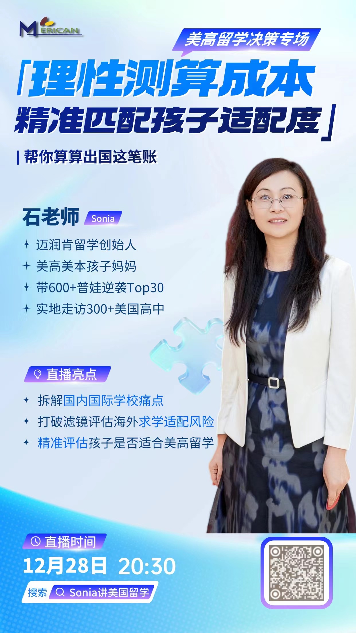 12月28日晚8:30,石老师与大家深入探讨国际教育与美高留学的规划与展望。本次分享将从三个维度系统解析,帮助家长们科学判断:什么样的孩子更适合出国留学,如何根据孩子的性格特质做出最适合的成长路径选择。 最近很多学生和家长都经常会问我们,孩子是在国内读国际学校好,还是读美高好?我自己的孩子也是在美初和美高读了4年半,在国际学校大概读了两年半,作为一个学生家长从我的角度看到了不同的方面,有好的一面也有不好的一面。所以我认为没有最好的只有最适合的。要根据孩子自身的情况来定。 我先说目前国内的国际学校,北上广好的国际学校不算很多,主要课程体系是有AP、IB、A-Level,但是一般老牌的IB的比较多,大家知道IB的课程难度都会大一点。AP学校主要是公立学校的国际部,A-Level的课程主要是英国体系的学校,目前国际学校的问题是什么,主要是师资力量,像很多学校的老师他可能学术并不是很强,没有教师资格证就教学。好的师资力量是非常少的。因为疫情很多老师都回国了,近几年来讲国内的外教参差不齐。 还有我看到的问题课外活动会比较少,大部分学生学术成绩很好,选了很多AP课程,同质化非常严重。主要是打竞赛,打竞赛的居多,但是如果从申请美本的角度来讲是缺少国际化。跟美高差别也是非常大的。 最主要是他们的活动不管是体育活动还是艺术活动以及学校资源和美高比,还是会有一些距离。有的学校建校时间比较短,主要还是以最后升学校为主,真正培养孩子的各种能力和提升为主。 好的一面就是离家比较近,父母能关注孩子的成长。但是现在国际学校的费用从4-5万到35万不等,但很多学校师资力量、体育活动还有对孩子性格的塑造我认为和真正的国际学校来比还是有一定的距离的。 我门最近遇到了一名学生,在香港的国际学校后来转到国内很有名的一所国际学校,他以前成绩单全是A,等到了国际学校之后他的成绩单就变成了BCD,甚至有F,对这个孩子来讲。他目前是7年级,他还有时间调整,但是想申美高对他的影响非常大的。所以说很多孩子像公立学校的孩子要申请国际学校,那一定要在选择学校方面注意。如果转了一所学校成绩不好,不管是对于你申请美高还是美本都会有很大的影响。所以大家在美初选美高的时候一定要注意这个学校和你孩子的匹配程度,这一点非常重要。 我觉得蛮可惜的,他的成绩单上甚至是有F,是因为这个学校要求比较高的,他成绩单压得很多,对于很多孩子对于性格塑造是有很大影响的。不要盲目的跟风,选择国际学校一定要慎重,根据自身的情况要多了解再进行确定。 美高其实很多家长看其他孩子出去了,可能觉得我自己孩子也要出去。我个人认为其实美高留学也不是天堂。为什么这么说呢?因为美高也有很多的问题。首先美高是下午3点就放学了,放学之后学校有一些体育活动和课外活动学生进行选择,如果你没有体育活动那你空闲的时间自己安排。那很多公立学校的学生他们已经很习惯的被学校安排作业,单让他自己去处理问题他自己不会安排。这样就会导致孩子打游戏,这种情况也会发生。 周末来讲很多美高都是要打比赛的,特别是在周六的上午。但是也有很多的学校带学生去博物馆。或者去超市。很多孩子就不去,从周五、周六、周日就会打游戏,这种情况我在美国的时候会遇到过。身边的一些学生,也有朋友的孩子。 美高来讲最主要的就是自主的能力,他们认为已经上高中你是有能力去处理各种问题。其实对美高面临最大的挑战就是文化差异和语言,很多孩子刚开始去是听不懂课的,他得至少需要2-3个月能跟老师和同学自主得交流。即使有些学生托福100分也是面临同样的困难和挑战。实际上最重要的就是在他们生病的时候自己独立在医务室,远离父母,会想家。最重要对于这么小的孩子来说,每逢佳节倍思亲,特别是在中国传统的节日,春节的时候。也会想家,这都是针对去美高留学留学生要面临的困难和挑战。 所以不要看很多学生进入名校,他们很光鲜亮丽的一面,他们面临很多的困难和挑战也是常人所不能达到的。所以家长朋友们我们不要只看到孩子很光鲜的一面,也要根据孩子自身的情况来决定。你的孩子适不适合美高留学。 我们在整个的过程中,我们有大部分的孩子申请的大学都很不错,也坚持下来。也会有个别的,一两名学生转回国际学校也会有,但毕竟是少的。 很多家长机会说,石老师国际学校也不是很好,美高留学也这么多问题,我的孩子到底应该怎么做呢?因为我自己也是一名家长,我是觉得从三个维度去评估孩子,你再决定孩子是不是适合美高留学。 第一点我认为近几年美国很多的学校,不管走读学校还是寄宿学校它们的学费涨了很多,比几年前涨了很多费用,特别是在洛杉矶、波士顿还有纽约,这些学校的学费是在5万左右。寄宿学校的学费几乎是在7-8万,总费用就是要在60万左右。但个别走读学校也是有30万人名币左右的,30万的我们也是能找到的。我们现在有个学生费用就是在波士顿4万美元左右。但我们也有一些学校是在4万左右的,像北卡。但总体来讲美国的费用还是蛮贵的。大概35-6.7十万不等。如果经济不是那么充裕学生和家长,我们也不建议去美国留学。要根据自身的情况来定是不是到美国留学。 第二点我认为你要根据孩子的性格特点,如果你的孩