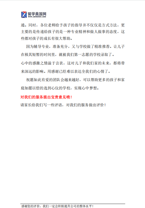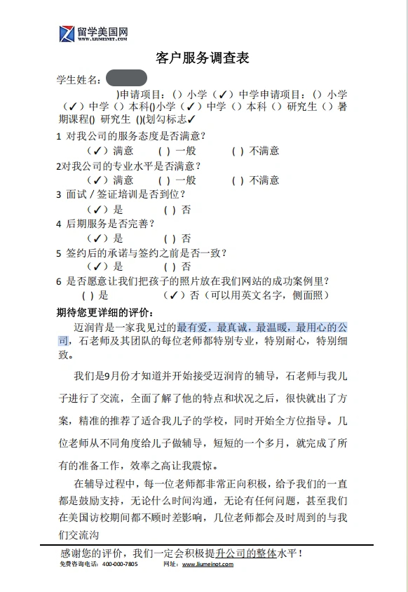 昨天,我们收到了一封来自家长的亲笔信。字里行间的情谊与信任,让我们久久难以平静,也让我们再一次深深感受到——教育真正的力量,源自一颗真诚的心,与一段用心的陪伴。 在留学咨询这条路上,我们从不将自己定义为单纯的“服务方”,而更愿成为家庭成长路上的“同行者”。我们知道,每一次的选择都可能影响一个孩子的人生走向,每一次的托付背后,都是一份沉甸甸的期待。 这封来信,既是一份肯定,更是一面镜子,映照着我们为何出发、又将走向何方。我们相信,只有带着真诚与温度,才能真正触及教育的本质,才能在孩子的心中种下成长的种子,静待花开。 下面,就让我们一起走进这份充满温度的评价,也一起重温我们与这个家庭走过的每一步。 家长感言: 迈润肯是一家我见过的最有爱,最真诚,最温暖,最用心的公司,石老师及其团队的每位老师都特别专业,特别耐心,特别细致。 我们是9月份才知道并开始接受迈润肯的辅导,石老师与我儿子进行了交流,全面了解了他的特点和状况之后,很快就出了方案,精准的推荐了适合我儿子的学校,同时开始全方位指导。几位老师从不同角度给儿子做辅导,短短的一个多月,就完成了所有的准备工作,效率之高让我震惊。在辅导过程中,每一位老师都非常正向积极,给予我们的一直都是鼓励支持,无论什么时间沟通,无论有任何问题,甚至我们在美国访校期间都不顾时差影响,几位老师都会及时周到的与我们交流沟通。同时,各位老师给予孩子的指导并不仅仅是方式方法,更主要的是传递给孩子的是一种专业精神和做人做事的态度,这些都对孩子的成长有很大帮助。 因为辅导专业,准备充分,又与学校做了精准推荐。让儿子在极其短暂的时间里,就被我们第一志愿的学校录取了。心中的感激之情溢于言表,这对儿子和我们家的未来,都将带来深远的影响。用感谢已经难以表达全我们的心情了。 祝愿如此有爱的团队会越来越好,可以帮助更多的孩子和家庭如愿以偿的选到心仪的学校,实现心中梦想。 留美网24小时热线:15011066813 专家热线:13910531929 微信公众号:liumeinet(迈润肯高中留学) 顾问微信:liumeinet2014