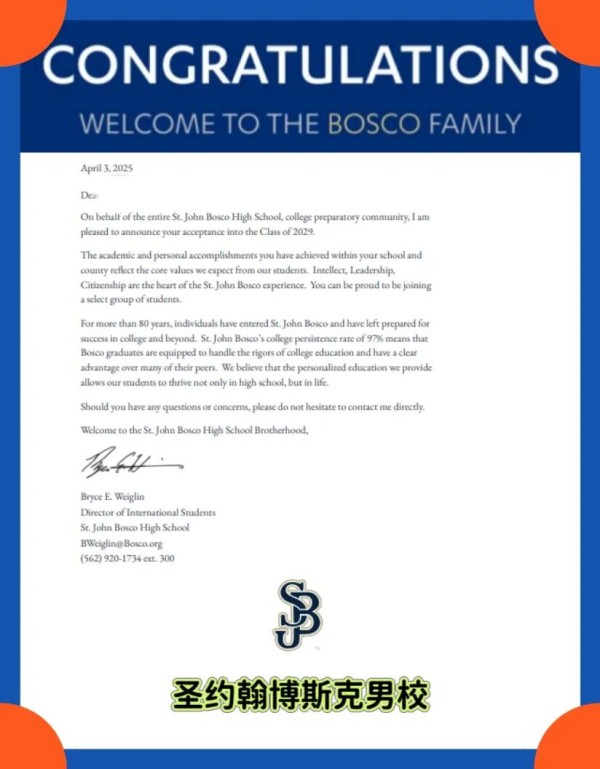 圣约翰博斯克高中(SJB)成立于1940年,是一所私立、全男性的天主教学校,由1940年唐·博斯科慈幼会。学校通过西方天主教教育协会(WCEA)获得西部学校和学院协会(WASC)的认可。,距今已有84年悠久历史,位于南加州核心区域,Niche排名A+,学术能力和体育竞技双优,被广泛认为是大主教区最具前瞻性和创新性的学术学校。加州校际学术联盟提名为“品质冠军”院校,所有核心课程受加州大学和NCAA批准,满足加州大学和加州州立大学的申请要求。学校既是“三一联盟”成员,又拥有全美排名第一的高中篮球运动员。凭借植根于信仰、智慧、领导力和公民意识的价值观,以及校内外丰富的兄弟情谊文化,将更有针对性地培养学生成长为全方位、多领域、高素质的综合型人才。