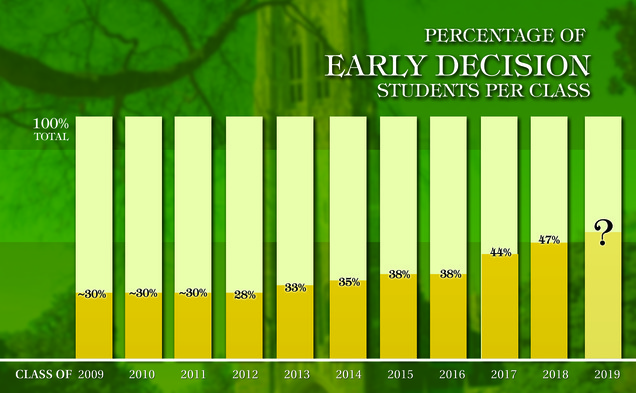 杜克大学的另一个有意思的数据是,在5、6年以前的很长一段时间内,ED录取的人数占总人数的比率一直维持在30%左右。但是近几年,这一比率一直在刷新,前年44%,去年47%,今年能否突破50%让我们拭目以待。
