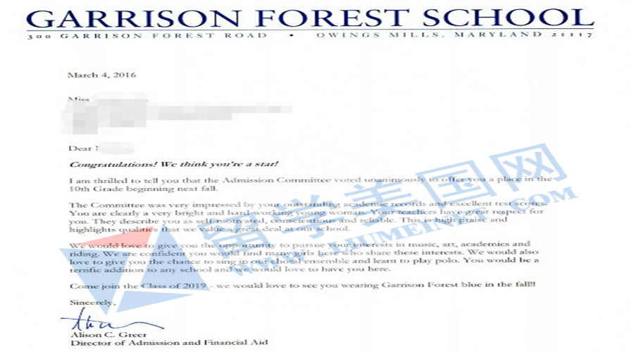 恭喜留美网YC同学获Garrison Forest School女子中学offer