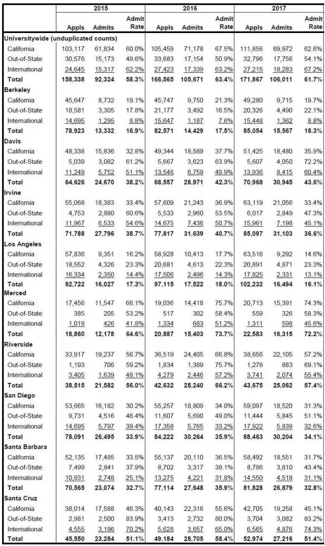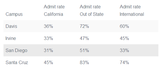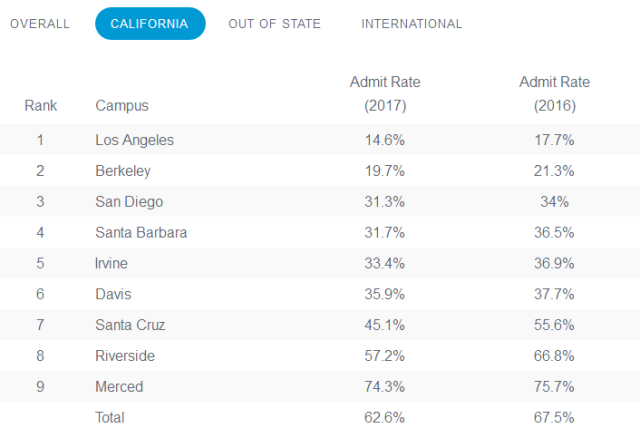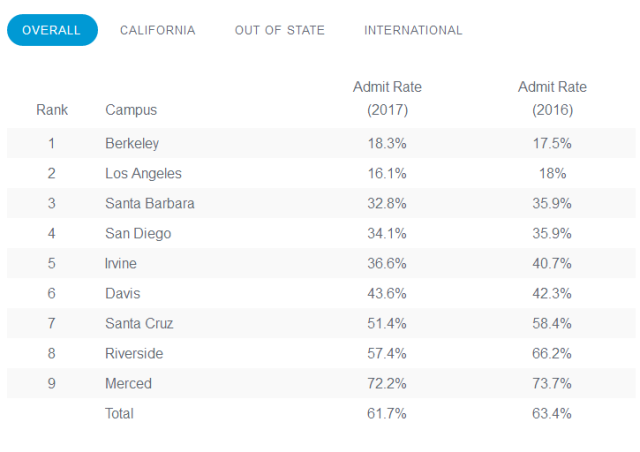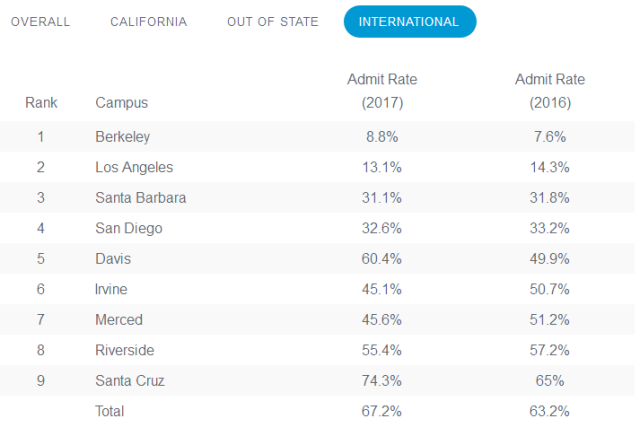 和去年相比,多数校区录取率上升。和上面两个表格对比看,可以发现美国其他州的学生申请伯克利大学和UCLA是最容易的。