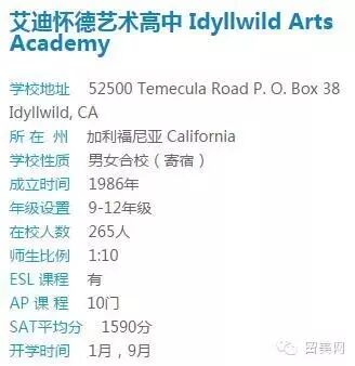 该校是西海岸地区唯一以艺术为主的独立寄宿中学,是美国仅有的三所艺术独立寄宿中学之一。学校位于南加州San Jacinto山区,海拔1500公尺的的山林地上,校园环境安全且淳美,距洛杉矶以东约90分钟车程。学校为了激励年轻人的智力,并让他们进一步发展各个领域的知识,该校提供具有挑战性的学科课程。小班制教学(一班大约 15 位学生)、关怀仁爱的教职员,还有令人兴奋的科目设计,奠定了 Arts Academy 的独特性。学校考察情况: http://t.cn/Rql8FIp