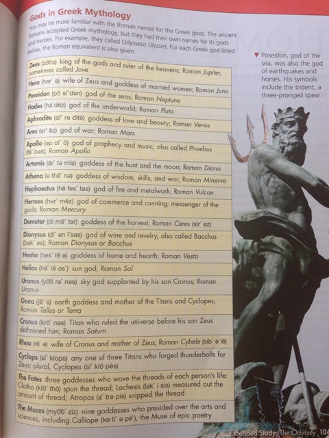 第三个单元,也是第一个学期的最后一个单元,我们读了荷马的史诗《The Odyssey》(奥德赛),讲述了欧德赛国王在攻打特洛伊战争胜利后,遭受宙斯等希腊神灵的谴责,在奥德赛的回家路上不断地折磨他,经过了10年的漫长旅程,才终于回到家乡。