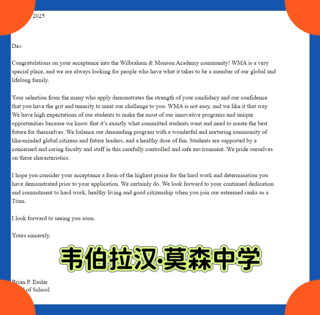 走读学校 http://www.wma.us 423 Main Street, Wilbraham, MA 01095 学校介绍: Wilbraham&Monson Academy韦伯拉汉莫森学院成立于1804年,学校位于波士顿西部的Springside,校园占地300英亩,环境优美,治安良好。该校的学术属于中等,国际生比例略高,但该校的课程非常特别,非常适合喜欢商科和领导力的学生学习。石老师曾经带学生去学校面试,学校的环境和硬件设施还是非常不错。 学校是由两所19世纪早期的学校合并而成的,一所是1804年创立的Monson Academy,另一所是1817年创立的Wesleyan (Wilbraham) Academy. Wilbraham Academy是该地区第一所寄宿制中学,而Monson Academy则是1874年开始第一所招收中国学生的美国中学。合并后Wilbraham & Monson Academy(简称“WMA”)兼具两所学校的特点并且持续发展。 学校位于波士顿西部的Springside, 是美国新英格兰地区第15所古老学校。校园占地300 英亩,环境优美,治安良好。与众不同的是,学校提供的学术课程、课外项目和各种学生团体,给学生的生活、学习和社交带来了活力。学校崇尚多样性,欢迎来自美国以外的各个国家的学生和老师,学院招收国际学生的历史已超过150年。 迈润肯成功案例分享: 学校优势: 1. 美国权威Niche排名A+ 2.课程丰富:AP课程24门,以供学生选择, 40%学生AP均分4-5/5;61%学生AP均分3分以上/529AP奖学金。 3.地理位置:学校所在的Wilbraham小镇,校园周围治安非常好。学校离波士顿90分钟的车程。 4.特色课程:学校有计划的组织商界人士来校演讲并通过开设一些下列特色课程,为学生在全球公民、企业、经济等方面做综合性的介绍。 5. 独有的工商企业和全球研究中心(CEGS):由学校的61届校友Mark R. Shenkman捐款建立,让学生有机会使用专有设施模拟在国内和国际市场的现场的商业票据的交易,以便更好的理解全球金融环境。最近学校在中心里增加”彭博“终端Bloomberg terminal,使该校成为唯一具有该设施的美国高中。 6.模拟联合国:由哈佛大学主办的会议上,来自世界各地的3,000名学生在四天的辩论,投票和交流中模拟了联合国的经验。WMA一直是会议的重要参与者,多名学生获奖或被特殊委员会录取。 7.全球教育基准组织(GEBG):WMA是GEBG的创始成员之一,GEBG是一个促进全球教育全国标准的组织。我们的教师被邀请通过分享信息,演讲和贡献出版物来教授其他学校的全球教育最佳实践。比如Dziura先生出席了全国会议;WMA教员通过iBook发布进一步的使命。 8.WMA通过虚拟高中提供在线课程。参加这些课程的学生可以在日程安排中与WMA教师协调员一起分配“在线学习块”,以监督他们的进度,参加并提供支持。这为学生提供了引导而独立的学习体验,所有在线课程都将获得WMA成绩单。 9.社区服务:入学时,每位学生都同意采用学院对广泛的智力发展,良好的身体健康,个人责任,相互尊重和服务承诺的信念。此外,WMA还提供每日社区服务团队,以满足下午的活动要求。 10.体育强势:WMA橄榄球队是新成立的马萨诸塞州青年橄榄球组织(MYRO)的一部分,该组织是美国橄榄球队的国家部队。 11.商科比较强,特色课程有:领导力、创业和全球研究课、证券市场分析、金融、经济学和外交课程。 12.大学升学走向:哈佛大学、普林斯顿大学、耶鲁大学、达特茅斯学院、康奈尔大学、宾夕法尼亚大学、卡耐基梅隆大学、加州理工大学、范德堡大学、圣路易斯华盛顿大学、约翰霍普金斯大学等。 学校概况: 建校时间:1971年 国际学生比例:30% 学校性质:寄宿混校 学生数量:425 宗教背景:非宗教 寄宿比例:50 % 校园面积:400英亩 师生比:1:4 开设年级:9-12年级 SAT:1500 课程数量:100+ 高级教师比例:73% ESL课程:有 校园设施: WMA校园的5幢主要的教学楼,3幢寄宿楼,科学中心,图书馆(20万册藏书), 计算机中心,美术中心,学校商店,操场,游泳池,网球场等。 学校周边: WMA校园位于马萨诸塞州西部小镇Wilbraham的中心。WMA距离波士顿约1.5小时车程,距离纽约则为2小时40分钟车程。WMA学生仅步行距离即可从学校到达附近小镇的咖啡馆、披萨店、便利店以及银行。生活也非常便利。WMA校园占据了超过400英亩(1.62平方公里)肥沃的农田和树木繁茂的山坡。 附近城市:波士顿 附近机场:波士顿洛根国际机场Boston Logan International Airport约85分钟车程 附近高校: 美国哈佛大学Harvard University 麻省理工学院Massachusetts Institute of Technology 波士顿大学Boston University 波士顿学院Boston College 课程设置: AP课程(26门): 英语:AP英语语言与作文、AP英语文学与作文; 数学:AP微积分AB、AP微积分BC、AP统计; 科学:AP生物学、AP化学、 AP环境科学、 AP物理 C:力学; 历史与社会科学: AP人文地理、AP宏观经济学、AP美国历史、AP世界历史:现代、AP心理学、AP微观经济学; 世界语言: AP法语、AP拉丁语、AP西班牙语、AP中国语言与文化(仅限在线); AP Capstone 计划™:AP 研讨会、AP 研究; 美术和表演艺术:AP 音乐理论 (仅限在线)、AP Studio Art:2D 设计、AP Studio Art:3D 设计; 计算机科学与技术:AP 计算机科学 A(仅限在线)、AP 计算机科学原理。 【英语】英语9、、英语10、荣誉英语9、荣誉英语10、美国文学、现代文学、研究与写作、世界文学:小说、创意写作、女性文学与性别研究、新闻学、小说研讨会、写作工坊; 【数学】代数1-2、荣誉代数1-2、几何学、荣誉几何学、大学预备数学、微积分预备、荣誉微积分预备、统计学、微积分、多重微积分等; 【科学】物理、高级物理、化