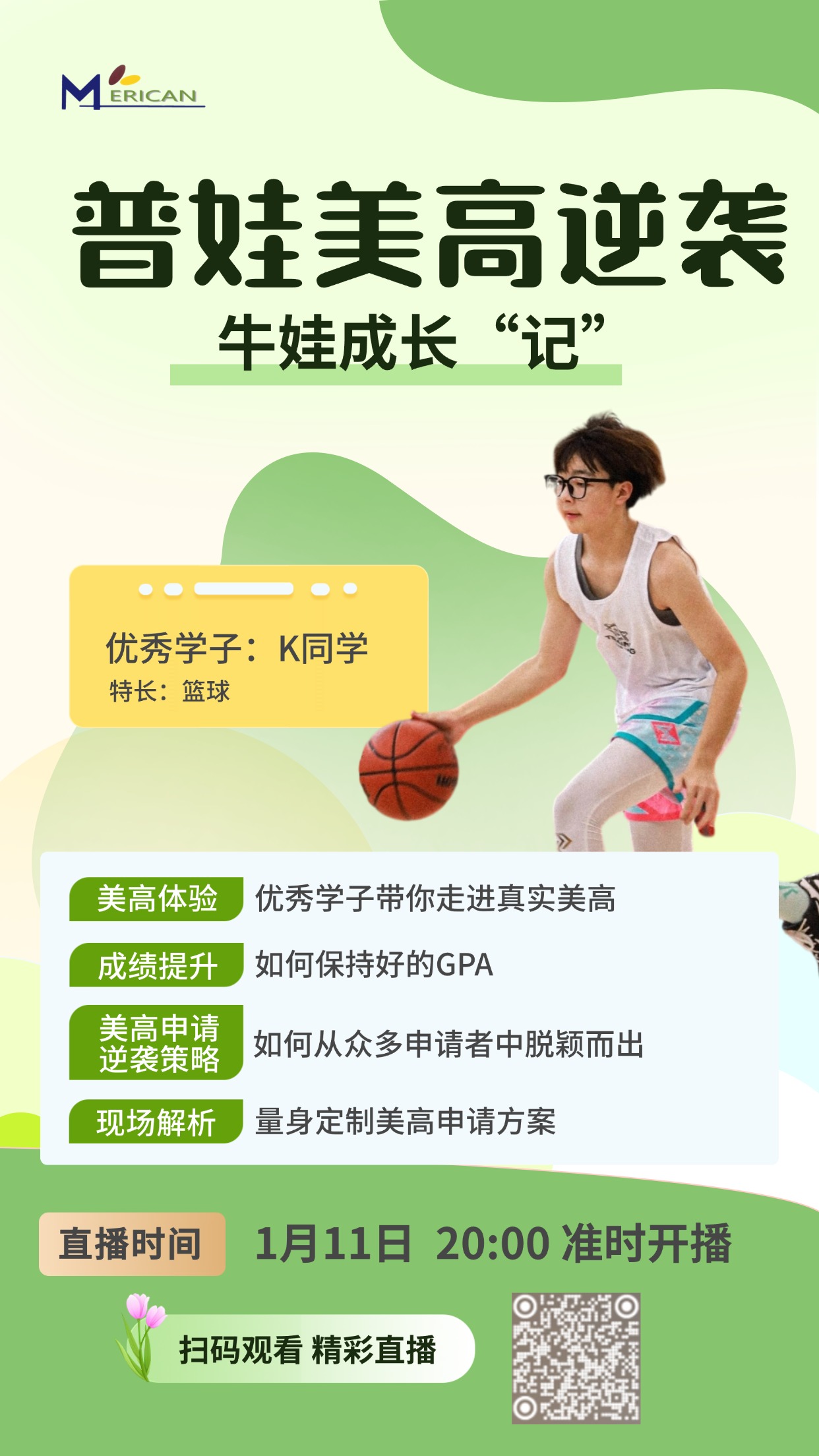 1月11日晚,迈润肯留学优秀学员K同学将亲身分享他的美高成长故事——从普通到杰出,看他如何适应美高、稳拿高GPA,一步步实现自我蜕变。 在这场直播中,他毫无保留地讲述了真实的美高日常,而且还分享最实用的学习策略。内容纯干货,错过直播的家长也无需担心,我们已经为你整理了完整的文字精华版。 石老师:今天我们非常高兴的邀请到我们迈润肯留学的学生小彻和大家分享一下他在美高的学习和生活。小彻就读于Oak Hill Academy,这所学校是一所寄宿学校,学校的篮球非常强。篮球在全美能排第二,有很多NBA的全员都毕业于这所学校。 小彻在这所学校就读半年,成绩也发生了惊人的变化,以前在国际学校读书,他的成绩单不是全A。但是目前为止小彻的成绩单几乎是全A,发生这样惊人的变化还是取决于他个人的努力,他喜欢篮球并且也喜欢健身,非常阳光的大男孩。最近来我们公司一次,发生了一些变化。下面就让小彻来和我们分享。 小彻:哈喽,大家好。我叫陈彻,我的英文名字叫科比。 石老师:小彻篮球打的非常棒,目前在Oak Hill Academy第三队。他们总共有五个队。小彻咱们先介绍一下学校。 小彻:我们学校在前几年霸榜全美第一,我现在在学校就读是9年级。学校有初中和高中,我们学校篮球非常厉害。如果你想提升你的篮球的话可以来我们学校。如果你是女生的话也有马术。学校宿舍挺大的。 石老师:在学校的就读感受和生活~ 小彻:我觉得在我们学校过的非常充实,几乎每周都会出去和别的学校打比赛。两三周会在本校打或者去其他学校。车程比较久,每次来回可能需要7、8个小时。 石老师:咱们先聊一聊,你是如何把成绩提到全A的? 小彻:主要是上课不能睡觉,不能在老师讲话的时候说话,上课不可以玩电子产品。上课要认真听课,作业按时交。如果有不会的会及时和老师沟通。 石老师:你现在都学了什么课程? 小彻:英语、英语提升、数学、编程、画画还有物理还有一些自习课。物理比较困难。 石老师:最近物理有没有补课? 小彻:有。抓紧时间把物理补上来。 石老师:你如何在短时间内把语言提升上来的。 小彻:在和朋友沟通的时候如果有不会的词会把中文翻译成英文,打到手机的备忘录了,读三遍大概就可以记住了。 石老师:有没有在学习上遇到一些困难? 小彻:比较枯燥比较无聊背单词。 石老师:你也在广州的国际学校待过,那国际学校和美高的差别是什么?有很多家长犹豫,我的孩子成绩并不是很好,又担心美高跟不上,美高真实生活是什么样子,你看打消家长的顾虑。 小彻:如果目标是出国的话不如早点出去。国际学校语言环境没有美国好,可能在国际学校学一年,不如在美高待三个月,每一天和外国人讲话,讲着讲着就熟了。对语言提升是有帮助的。 美国学校的老师和我们会更像朋友,更友好。如果想要体育运动,国外会被国内好成百上千倍。因为你在美国假如你是打篮球踢足球的话,对手都是高你三四个档次,你要是每天都和他们对抗,等你回中国的时候就会感觉打之前的队友就和打小孩一样。 石老师:小彻非常喜欢篮球,篮球也打的非常好。所以他选择到美国读书。你的课外活动都有哪些? 小彻:我觉得你喜欢篮球的话就选择篮球学校,以此类推,如果你喜欢哪项运动,你就搜哪所学校这个项目最好。他们的课外活动肯定会有很多的。 石老师:你们队是几点到几点训练? 小彻:我们队是6点五十到八点半。有时候早上也会让我们去训练。一天至少训练两个小时。周末也会训练。一周要训练七次。一队和二队都非常厉害。 石老师:他们学校总共有五个队,小彻在中间的队。通常美国学校是下午3点钟左右到五点或者六点训练。因为小彻他们队太多了,他属于第三个队,所以是六点五十到八点五十左右训练。小彻在这半年的收获是什么? 小彻:我觉得最大的收获就是让自己静下来了。 石老师:很好。我觉得你最大的变化就是沉稳了,变得更加强壮了。和我们说说你的目标 小彻:不管做什么挣到钱吧。 石老师:小彻很棒。在美国周末都做什么? 小彻:像我们学校周六上午是要上学的,下午就有可能出去比赛,如果不出去比赛的话照常训练。周末上午要去教堂,强制要去。学校是教会学校。 石老师:谈谈美国的伙食怎么样? 小彻:我是那种吃的习惯的那种,有米饭,都是自助餐。也会有中国菜,有春卷。 石老师:现在有些孩子也是对篮球感兴趣,你建议他们到美国读书吗? 小彻:如果你想变强的话一定要到美国。逃离舒适圈。 石老师:过去美国之后,有没有面临什么大的挑战? 小彻:刚去的时候也没有遇到什么挑战,过渡的还是挺好的。和同学之间的关系也很好。 石老师:你的学校走出过卡梅,凯文、杜兰特等球星。篮球项目在学校非常重要,你们的教练应该非常厉害。你给大家讲讲你的篮球生活,篮球教练。 小彻:篮球教练可能在美国比较火,但是我不认识。一个队有三个,一队比较多,可能有八个。一队一般都能打上NBA。 石老师:你觉得他们友好吗? 小彻:我觉得还可以。反正不坏。 石老师:你篮球训练大概坚持了7年。 小彻:最近三年才是正经训练。每天都会投入两个小时。 石老师:你是怎么坚持下来的? 小彻:爱好吧。 石老师:你觉不觉得有点累? 小彻:我觉得就和赚钱一样吧,会让我很开心。 石老师:英语刚开始很弱,你是怎么提升的,就你刚才说的查单词,背单词,自己主